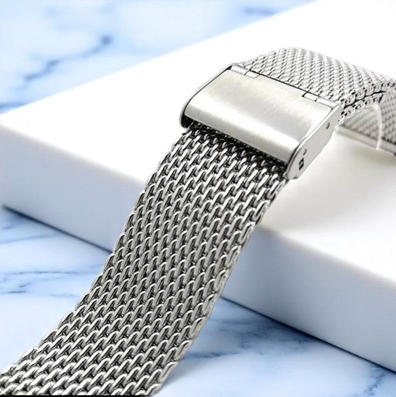 Crafted from premium-grade stainless steel, this mesh strap combines timeless elegance with modern resilience. Its finely woven design ensures breathability and flexibility, while offering exceptional resistance to rust, corrosion, and daily wear. Lightweight yet durable, it delivers a sleek, comfortable fit perfect for both professional settings and everyday sophistication.