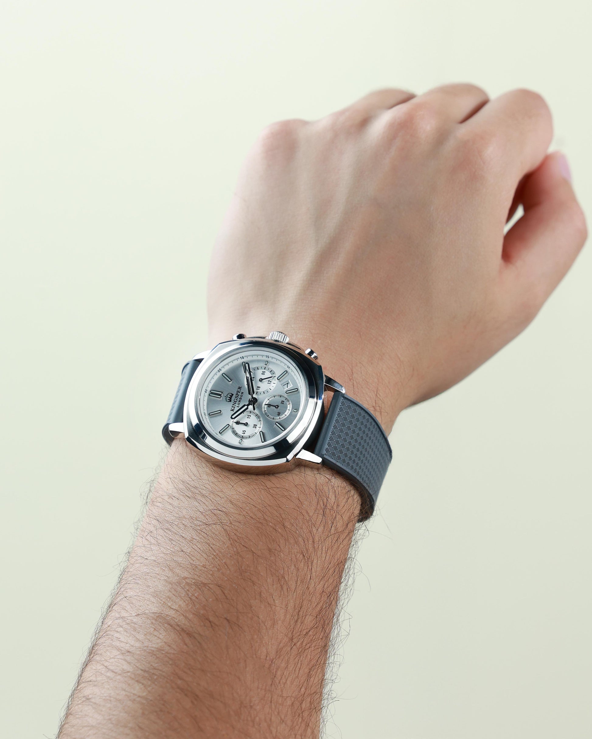 The Monarch features a stainless-steel case, masterfully constructed to blend durability with refined style. Its unique tonneau shape is highlighted by polished facets that brilliantly reflect light, creating a striking visual impact. The combination of brushed and polished surfaces not only adds depth but also accentuates the dynamic, multifaceted nature of the watch's shape. This is complemented by a sleek light silver dial, making it a standout piece of craftsmanship.