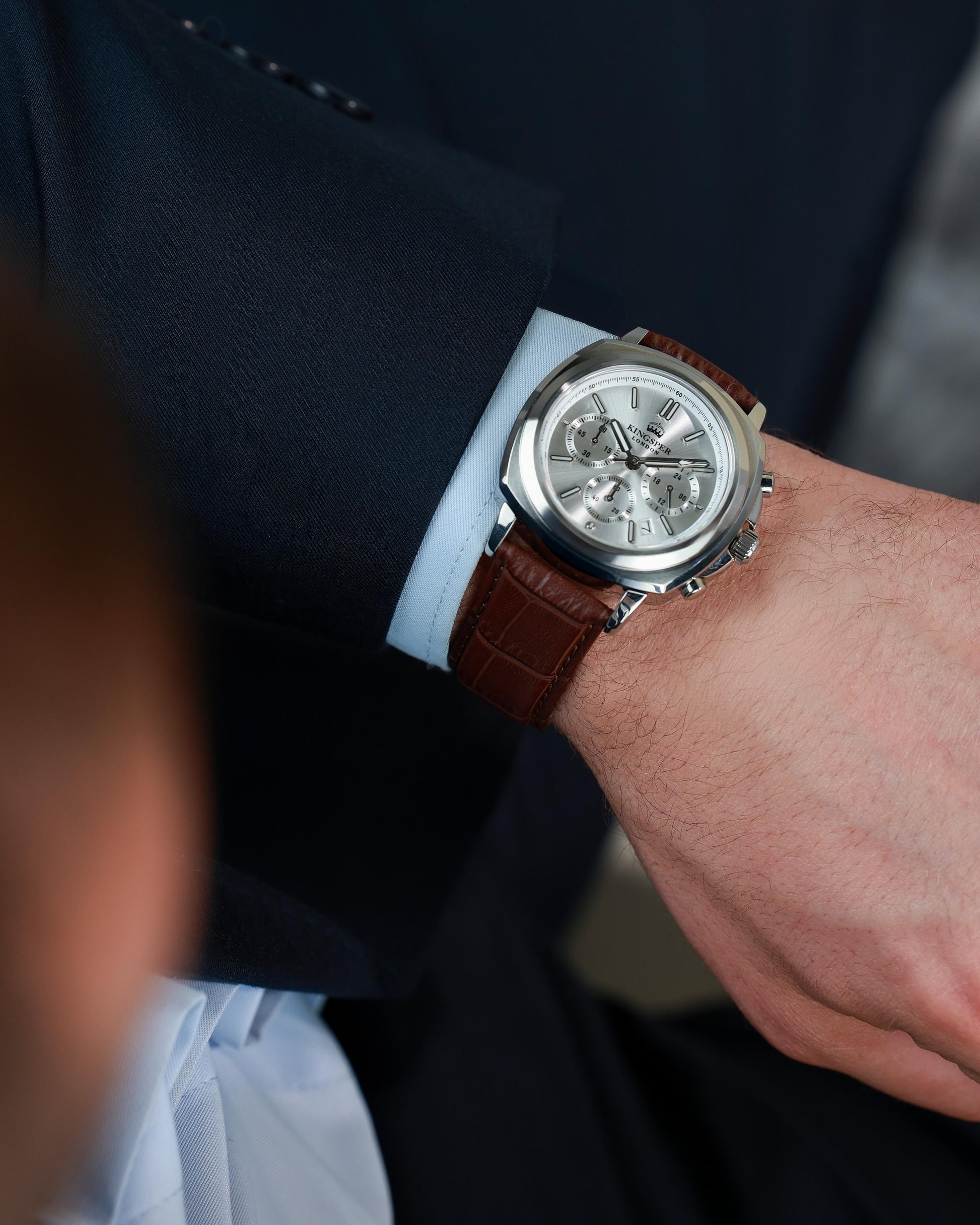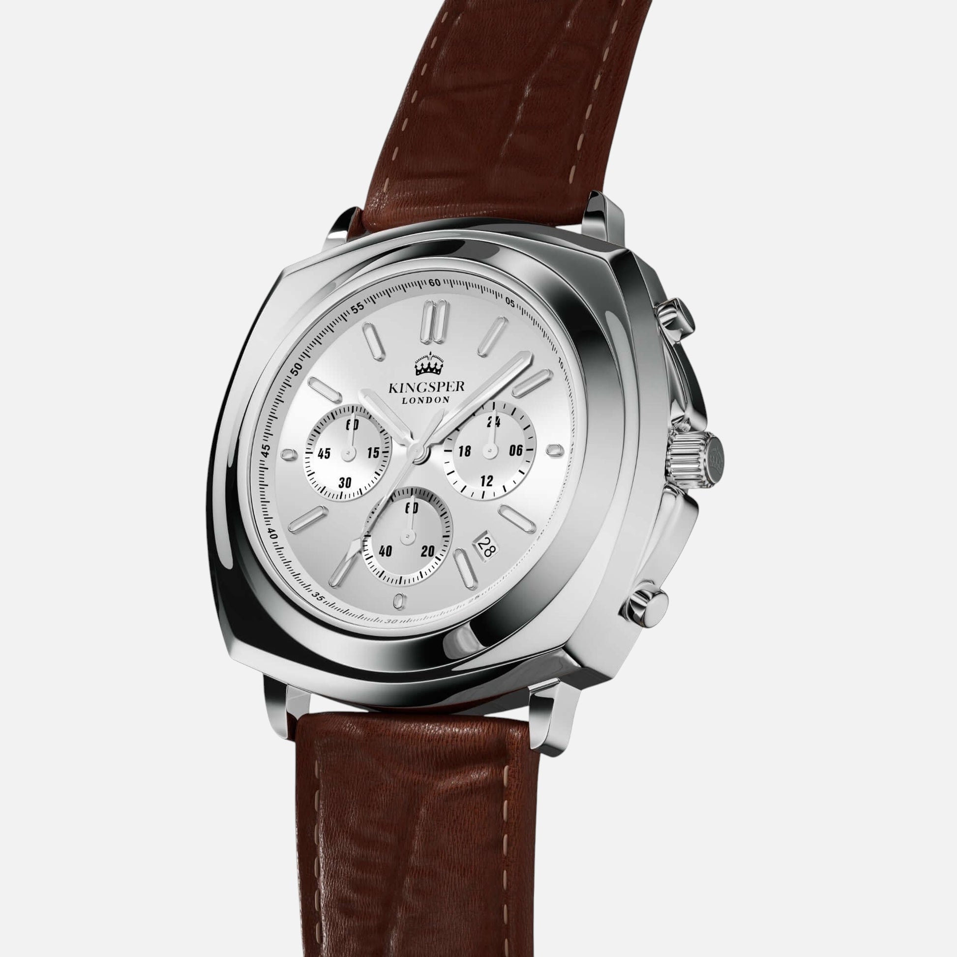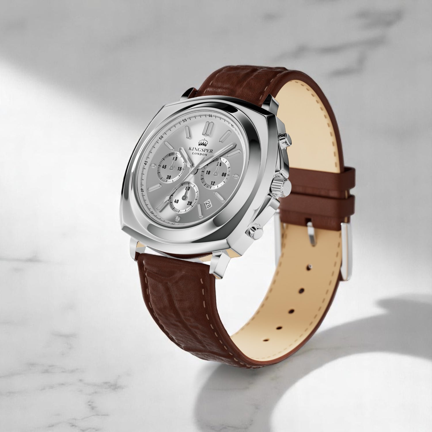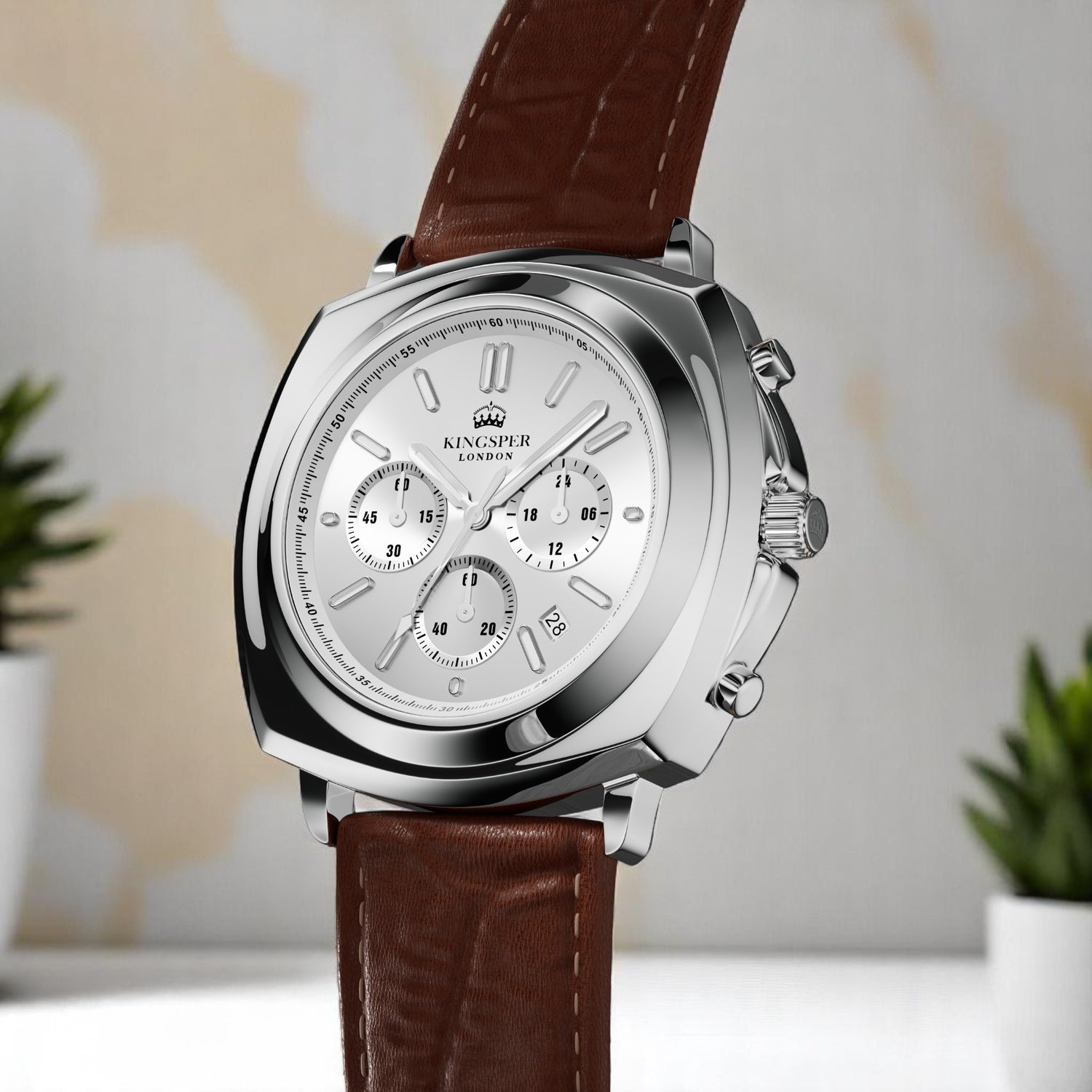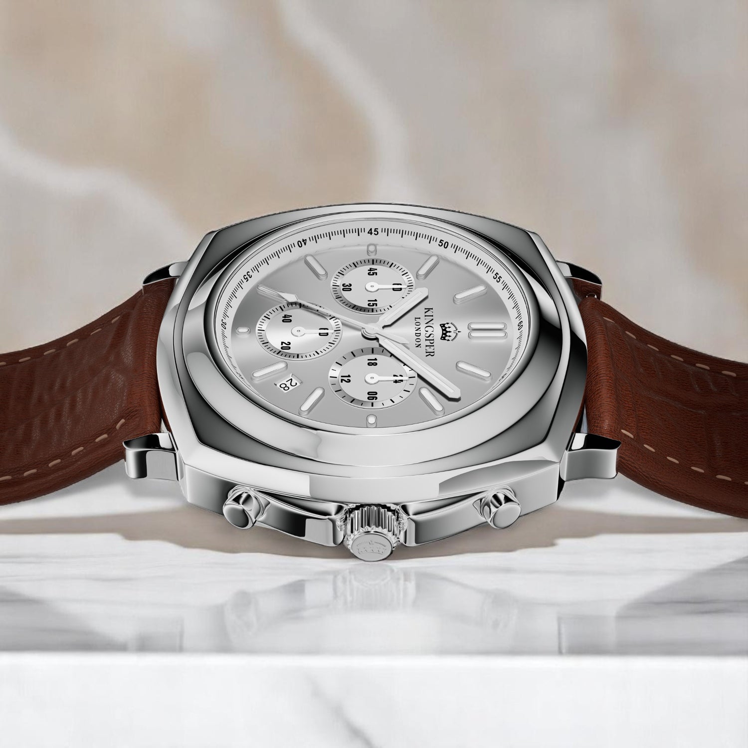 Amid the unyielding pace of the urban sprawl, where each second counts, The Monarch moves with intent. Clad with the Monarch watch by Kingsper. Crafted from polished stainless steel with a light silver dial, this watch is a testament to resilience and refined ambition. As Alex navigates through critical decisions and pivotal moments, his Monarch watch is more than just a timekeeper; it's a symbol of his steadfast pursuit of excellence, mirroring his resolve to master every challenge with precision.