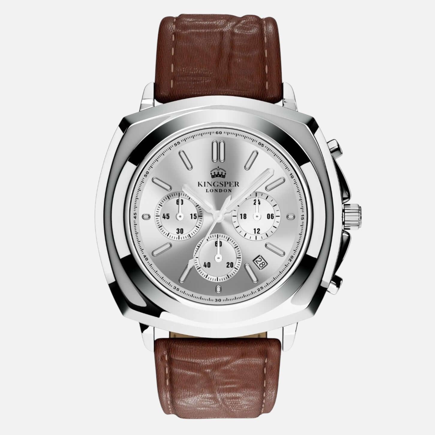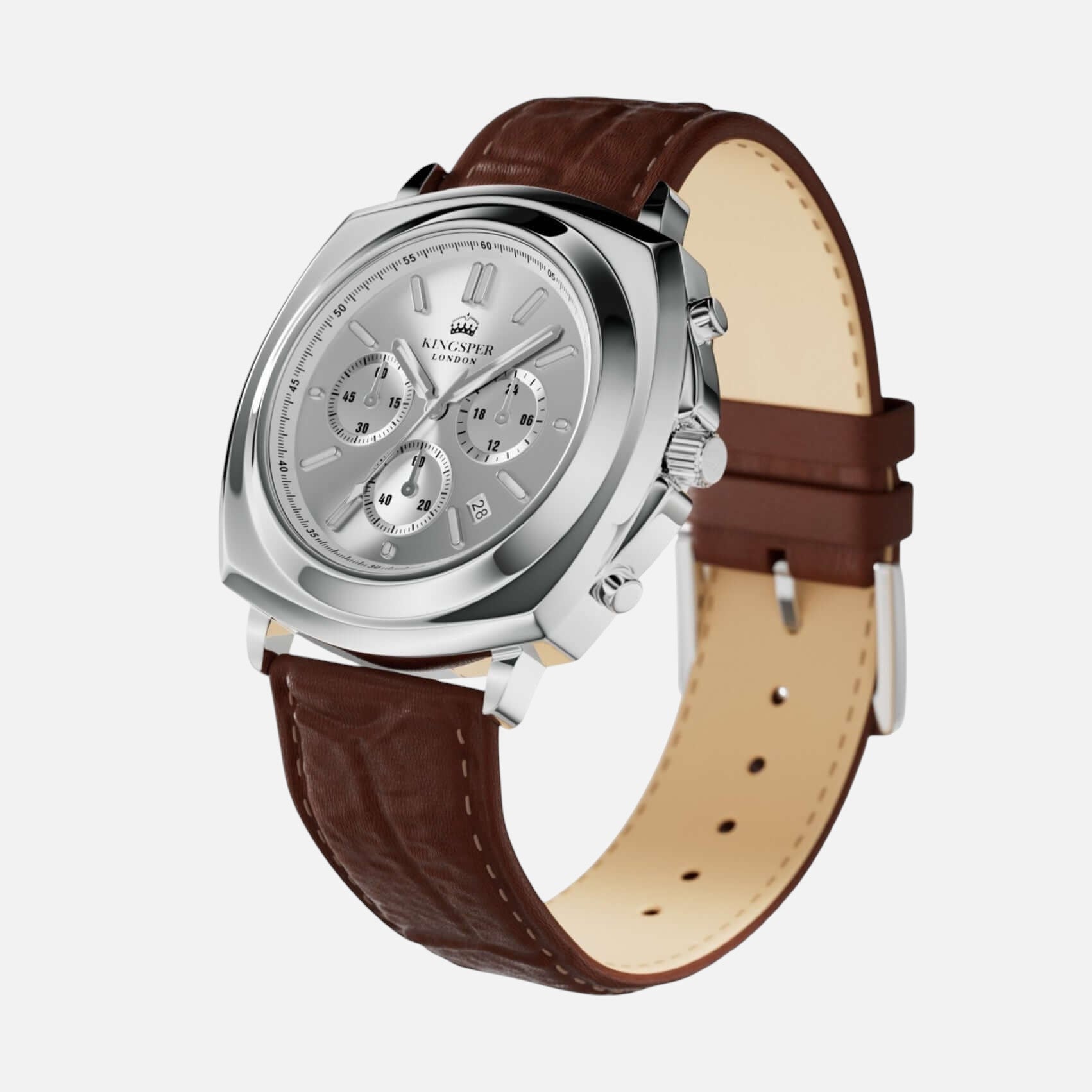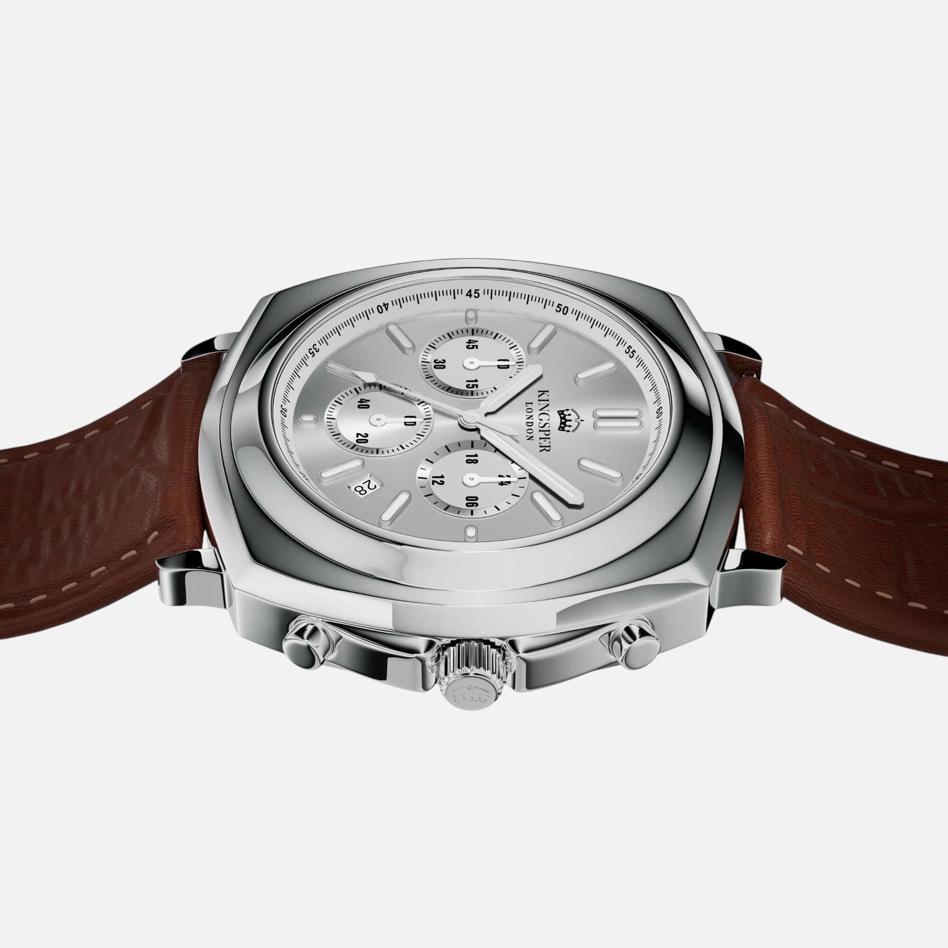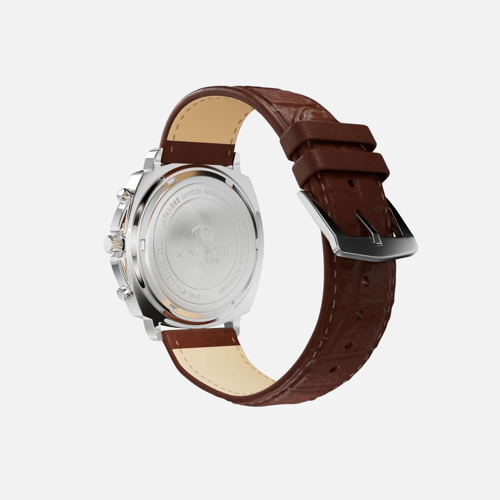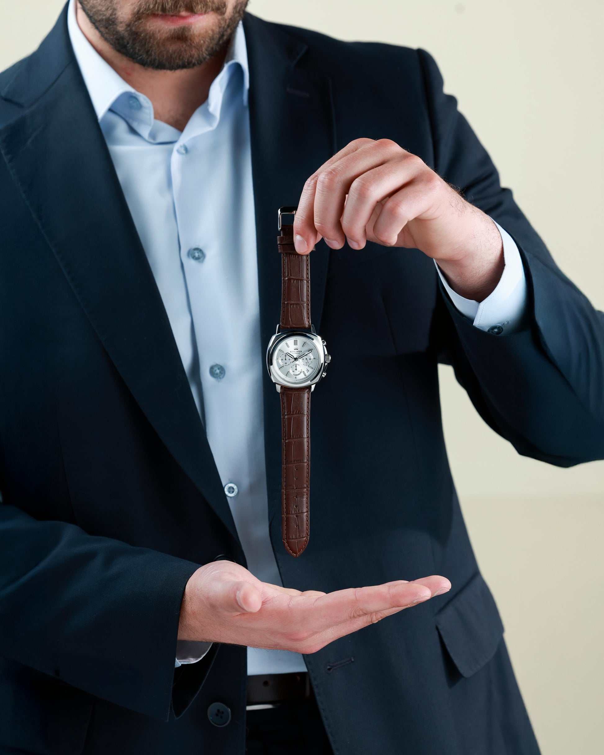 Amid the unyielding pace of the urban sprawl, where each second counts, The Monarch moves with intent. Clad with the Monarch watch by Kingsper. Crafted from polished stainless steel with a light silver dial, this watch is a testament to resilience and refined ambition. As Alex navigates through critical decisions and pivotal moments, his Monarch watch is more than just a timekeeper; it's a symbol of his steadfast pursuit of excellence, mirroring his resolve to master every challenge with precision.