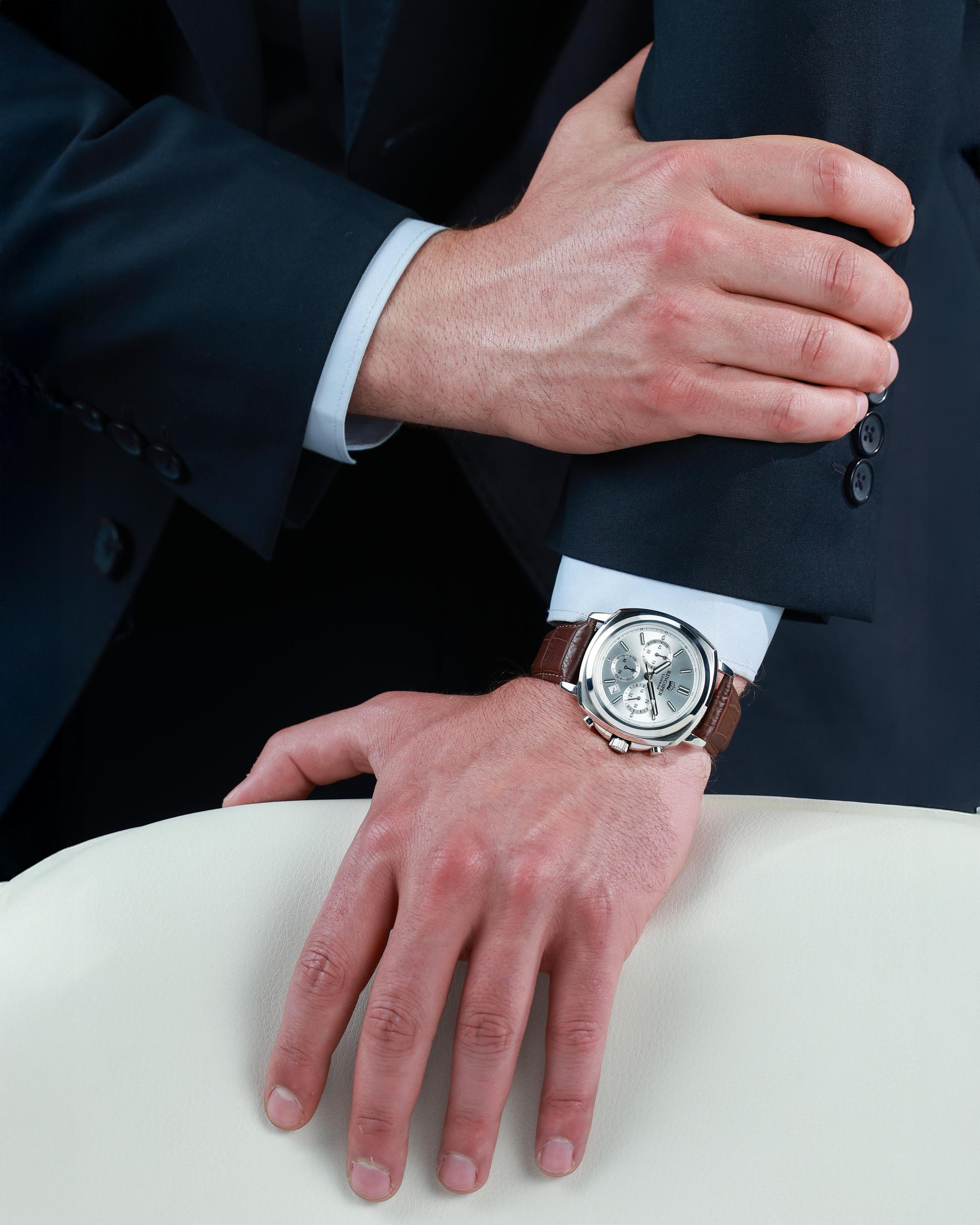 The Monarch features a stainless-steel case, masterfully constructed to blend durability with refined style. Its unique tonneau shape is highlighted by polished facets that brilliantly reflect light, creating a striking visual impact. The combination of brushed and polished surfaces not only adds depth but also accentuates the dynamic, multifaceted nature of the watch's shape. This is complemented by a sleek light silver dial, making it a standout piece of craftsmanship.