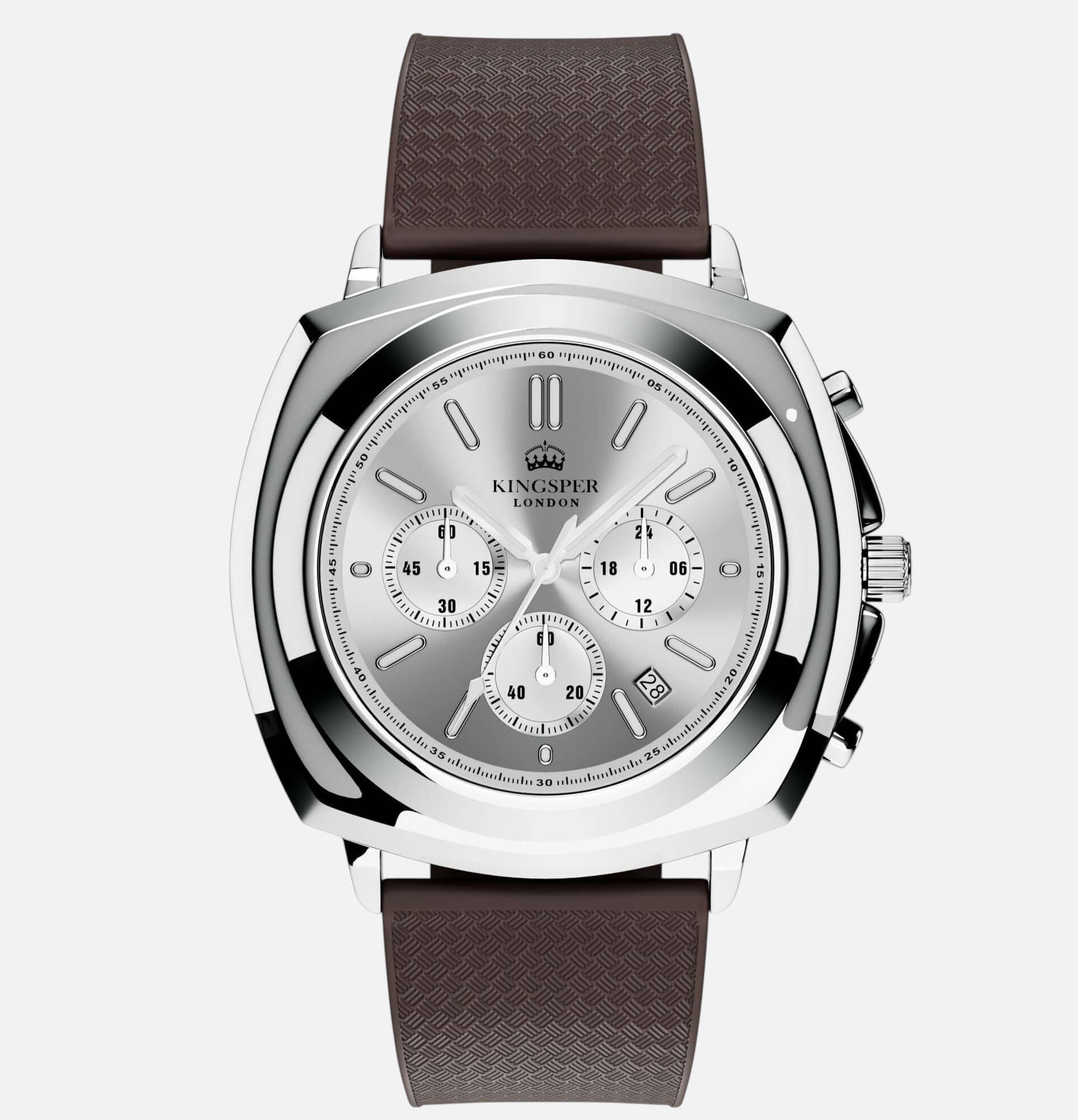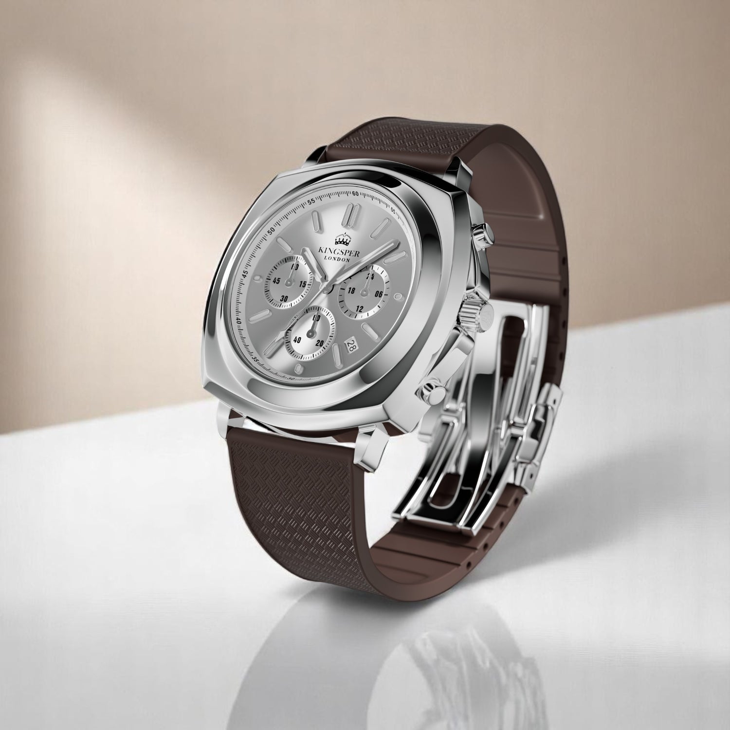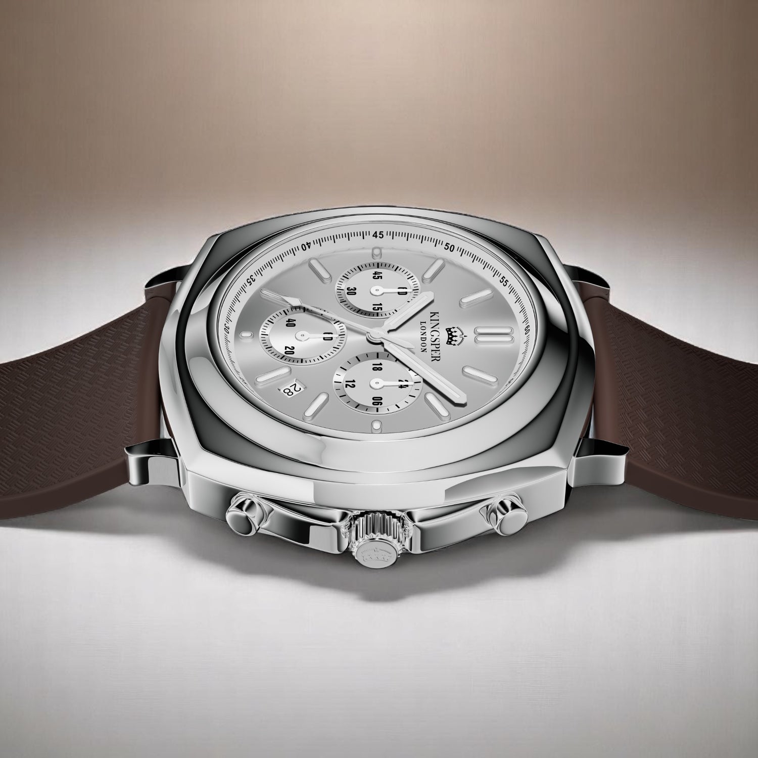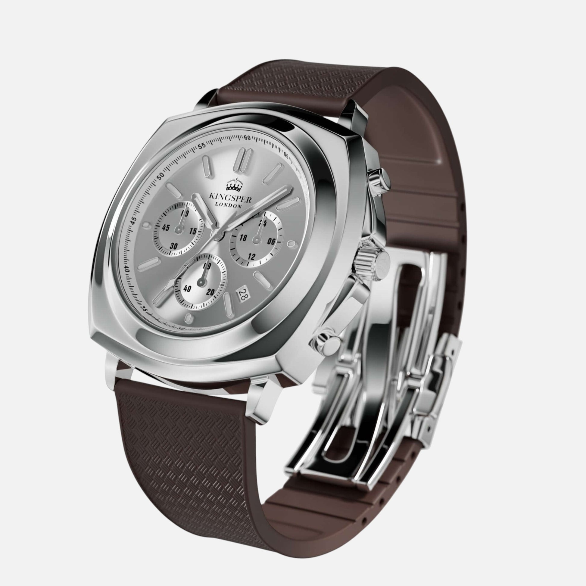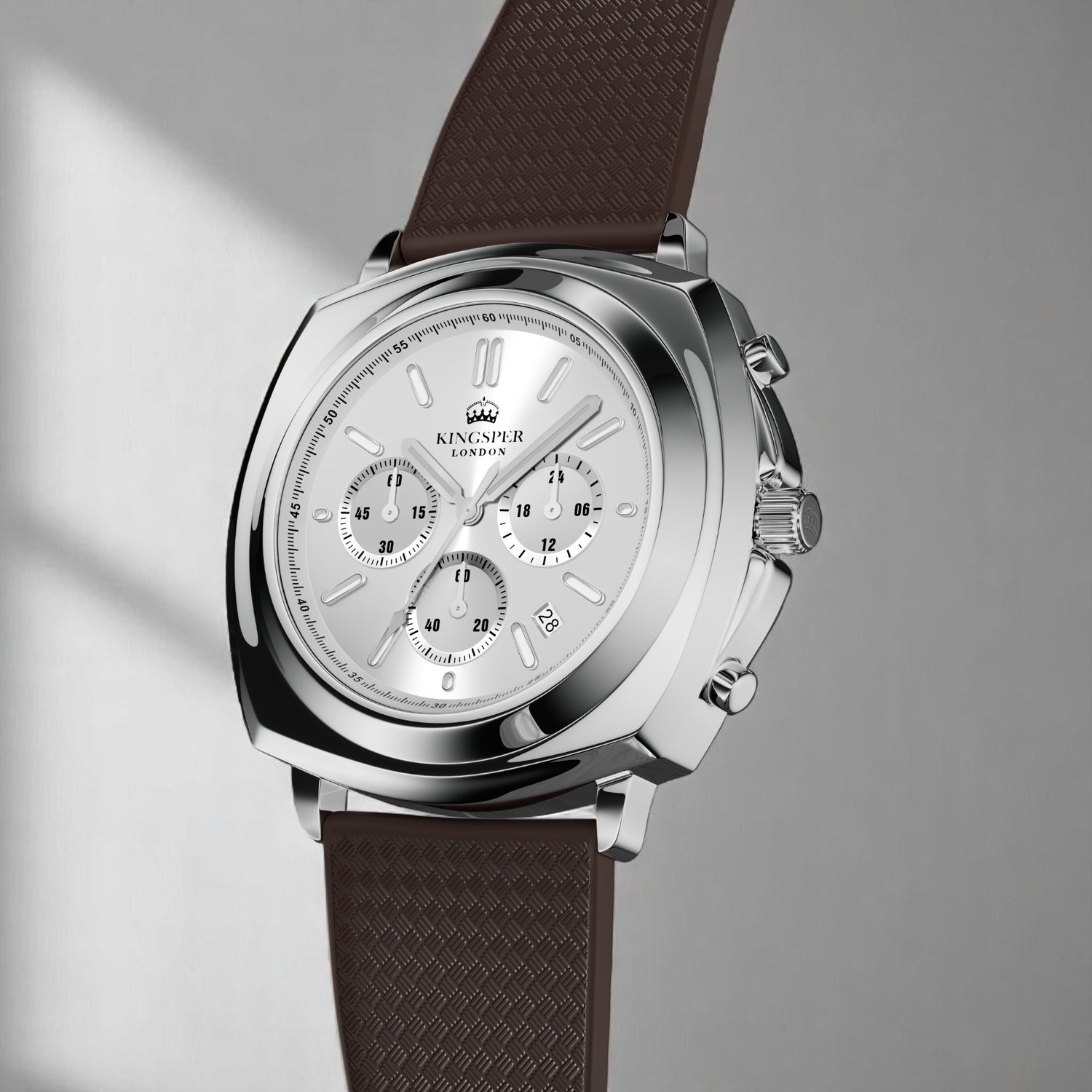 Amid the unyielding pace of the urban sprawl, where each second counts, The Monarch moves with intent. Clad with the Monarch watch by Kingsper. Crafted from polished stainless steel with a light silver dial, this watch is a testament to resilience and refined ambition. As Alex navigates through critical decisions and pivotal moments, his Monarch watch is more than just a timekeeper; it's a symbol of his steadfast pursuit of excellence, mirroring his resolve to master every challenge with precision.