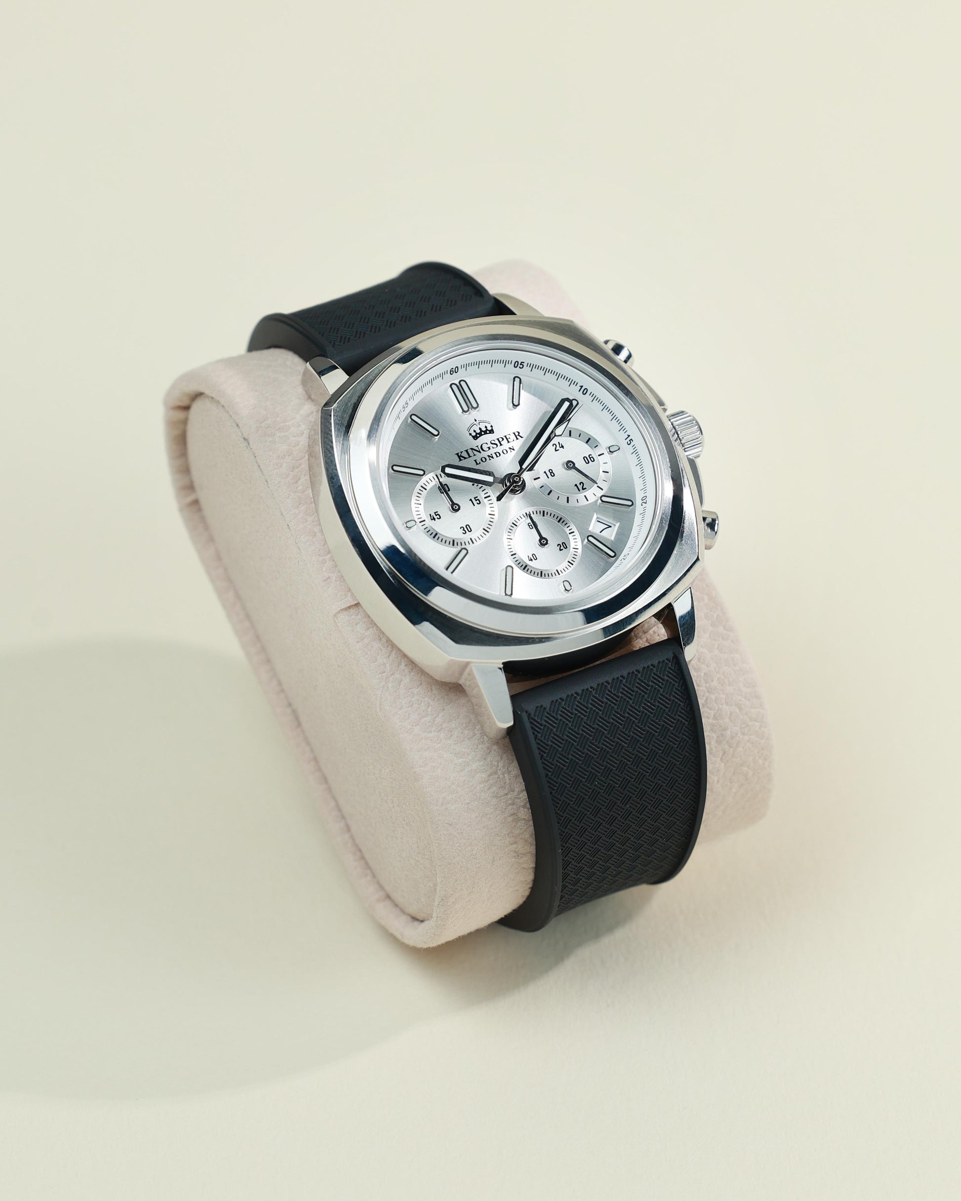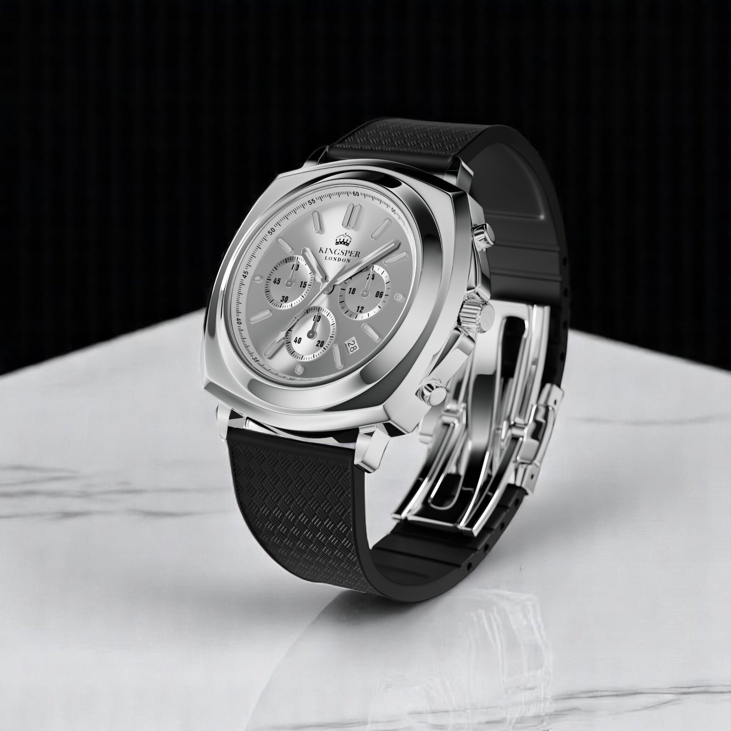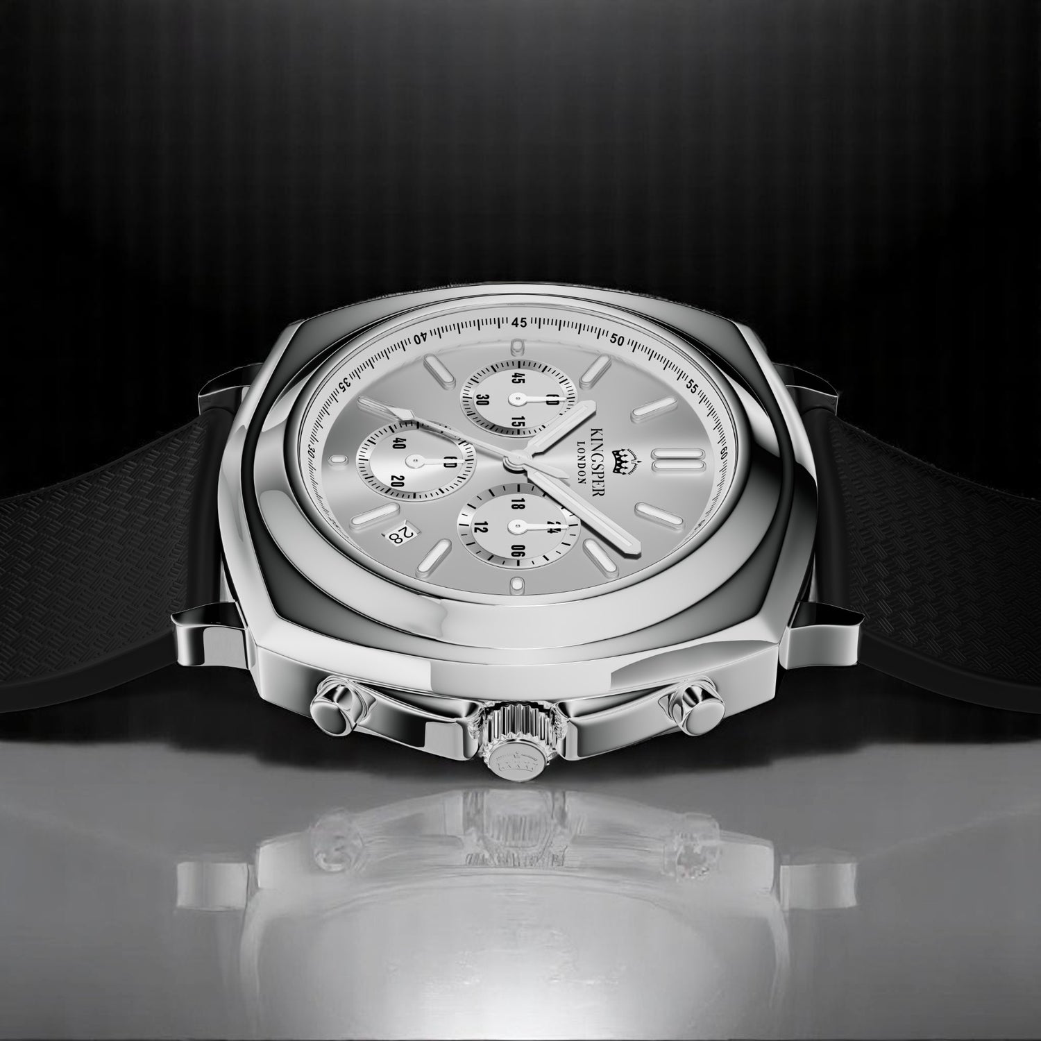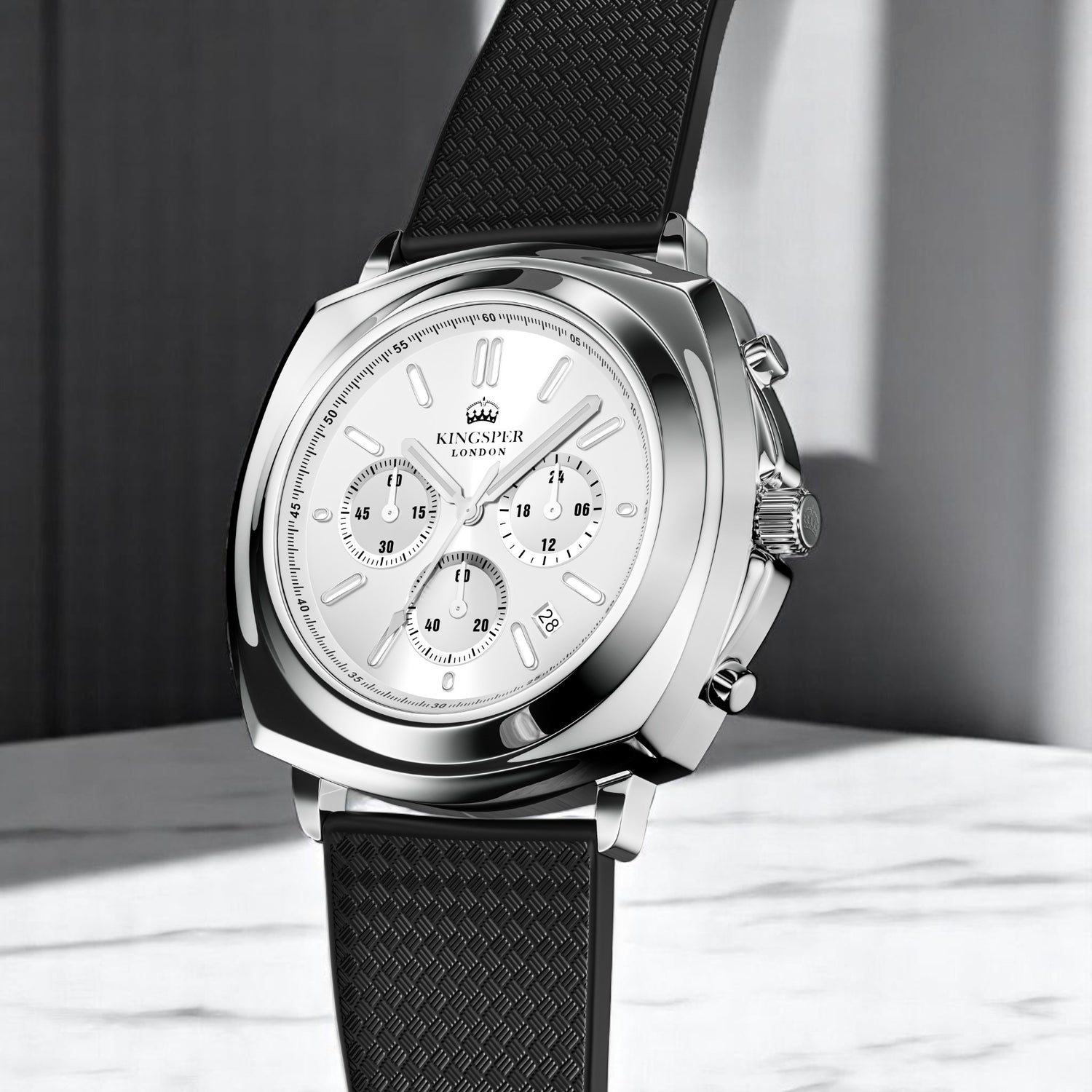 Amid the unyielding pace of the urban sprawl, where each second counts, The Monarch moves with intent. Clad with the Monarch watch by Kingsper. Crafted from polished stainless steel with a light silver dial, this watch is a testament to resilience and refined ambition. As Alex navigates through critical decisions and pivotal moments, his Monarch watch is more than just a timekeeper; it's a symbol of his steadfast pursuit of excellence, mirroring his resolve to master every challenge with precision.