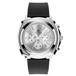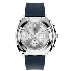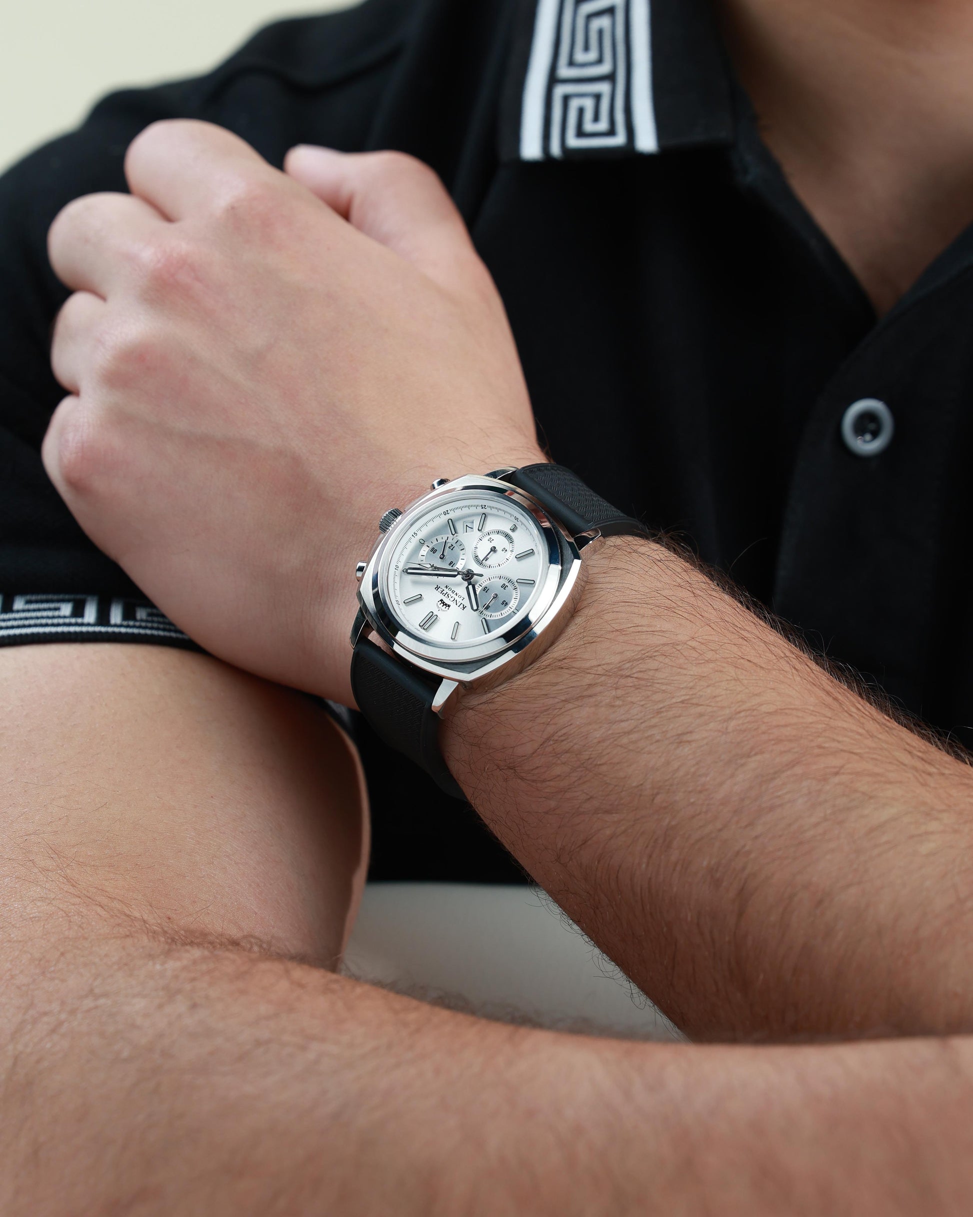 The Monarch features a stainless-steel case, masterfully constructed to blend durability with refined style. Its unique tonneau shape is highlighted by polished facets that brilliantly reflect light, creating a striking visual impact. The combination of brushed and polished surfaces not only adds depth but also accentuates the dynamic, multifaceted nature of the watch's shape. This is complemented by a sleek light silver dial, making it a standout piece of craftsmanship.