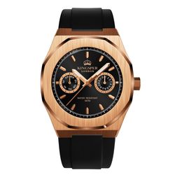 The Valiant features a rose gold stainless steel case, masterfully constructed to blend durability with refined style. Its unique octagonal shape is highlighted by polished facets that brilliantly reflect light, creating a striking visual impact. The combination of brushed and polished surfaces not only adds depth but also accentuates the dynamic, multifaceted nature of the watch's shape. This is complemented by a sleek black dial, making it a standout piece of craftsmanship.